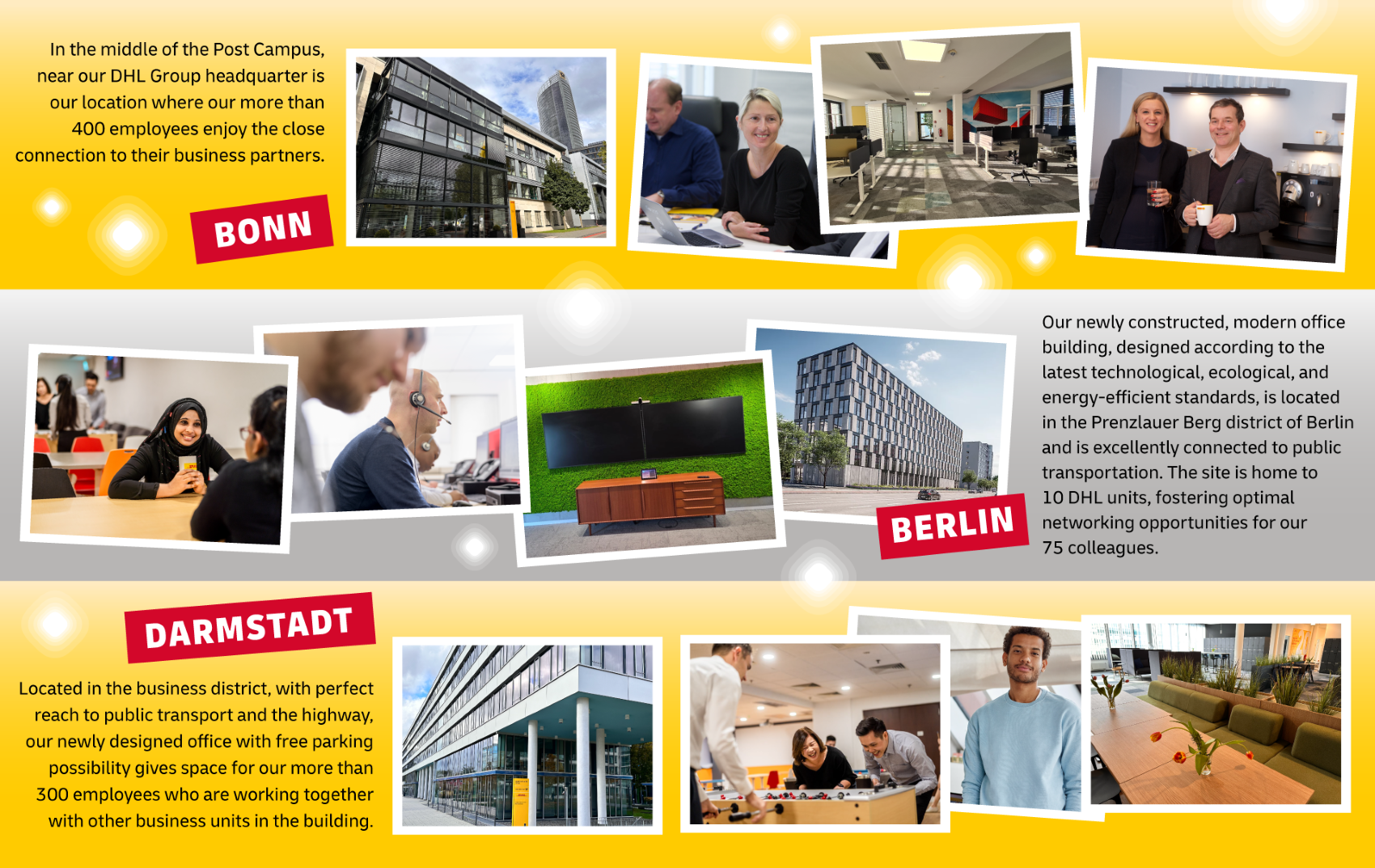 More than 800 people are working for Deutsche Post IT Services GmbH in Berlin, Bonn and Darmstadt. Our flexible and agile teams are into certain projects and using the newest technologies. Our teams are living a culture of diversity, team spirit and can do attitude. Our strength is our maturity in knowing the business of the DHL Group since 2002. We are an own legal entity that's why you need to search for Deutsche Post IT Services GmbH to find us.